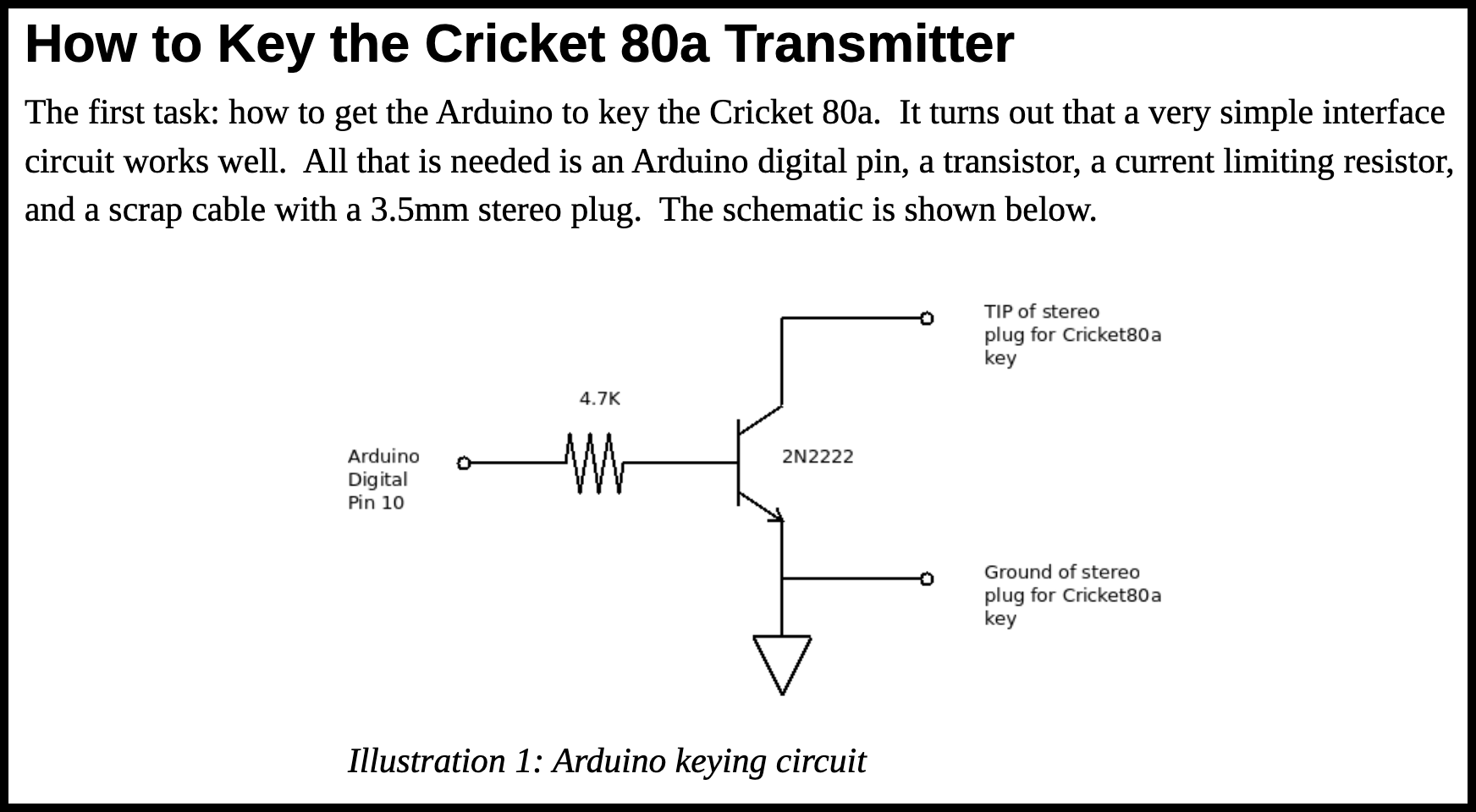 #13 shows that this board/code can control a relay, but it is loud and large. It should be possible to key the radio with a transistor, even if there is a fair bit of current on the keying circuit (as there is in the NS-80 transmitter, but not the Cricket).