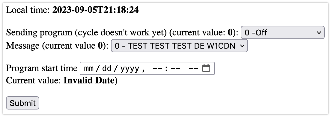 subtract current time from start time in millisecondsRTC built-in alarmtimer.at(time, function_to_call);(with time in milliseconds?)yourInputSend. - Show on webform when cycle/program is active (programRunning == true) (#37)function should then calltimer.every(interval, function_to_call);and expirethetimer.every()function is probably a wrapper to update the variables that go intomorseToSend(and `morseToSend_blink).how long thetimer.every()interval should behow many times to JLedRepeat()send to fill the step lengthHTML field is datetime-local, which needs to be labeled as UTC.