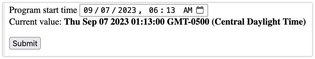 All back on local time now. The current time is saved with an epoch shift according to the timezone offset in JS. The start program time is local by default from the HTML form. Both are stored as unix timestamps on the C++ side.